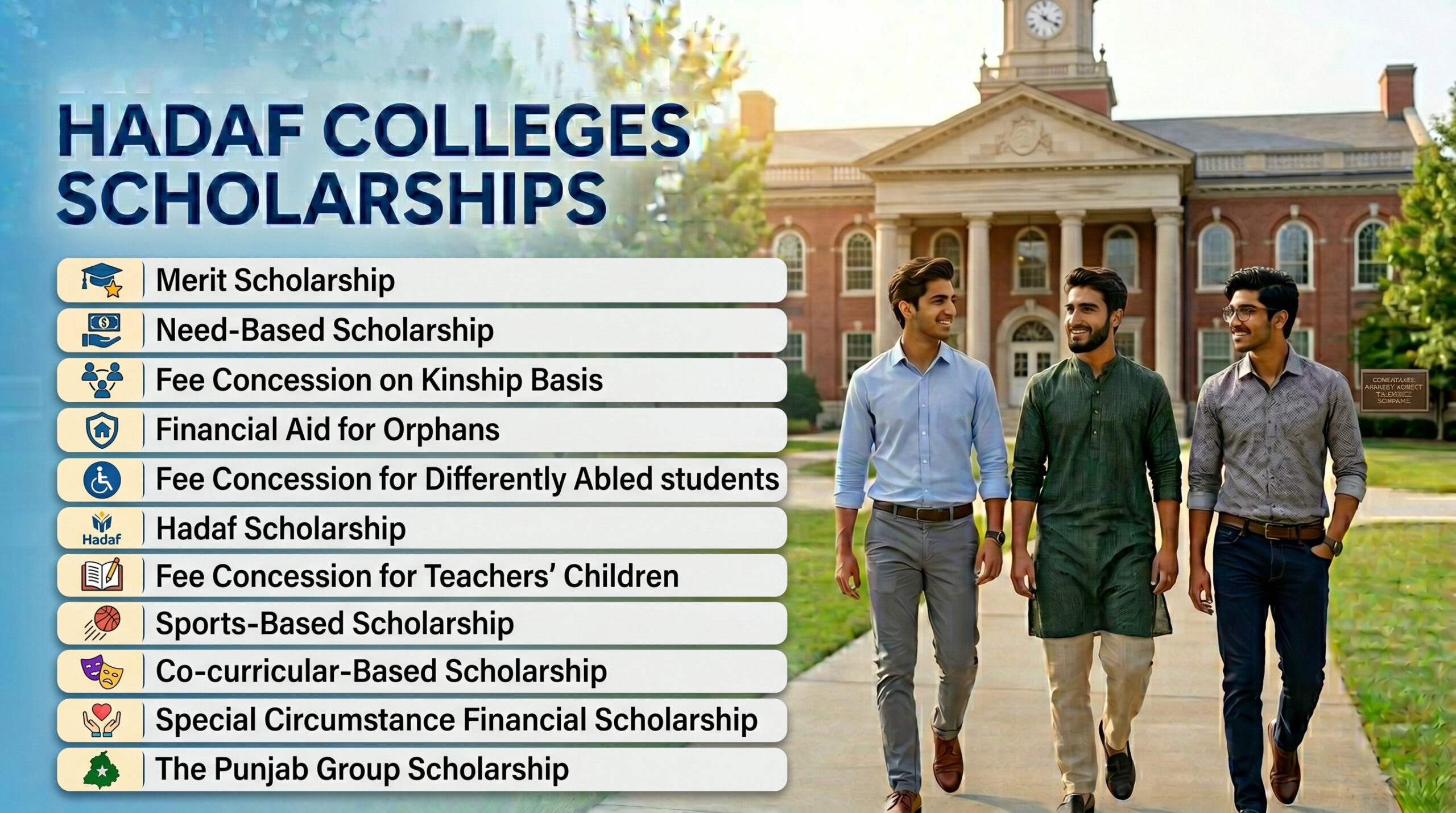 Hadaf Colleges help offer a wide range of scholarship programmes with the purpose of providing affordable education and appreciating the hard work of students. Below are the types of scholarships and their special features at Hadaf Colleges: